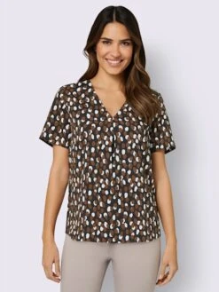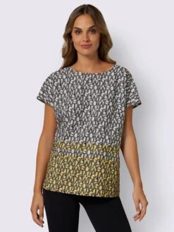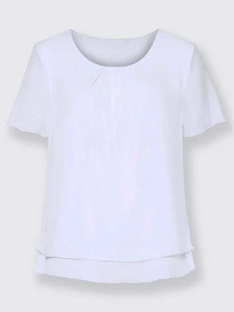Chemisier en mousseline avec combiné en interlock élastique et manches légèrement transparentes. Plis sous l’encolure ronde pour une largeur flatteuse. Pinces poitrine structurantes et ourlet légèrement arrondi.