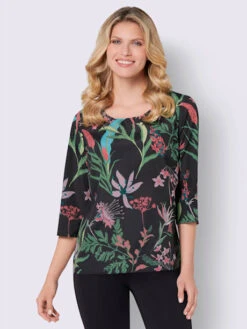 Ravissant chemisier en qualité satin légèrement brillante et doté d’un superbe motif floral. Col montant smocké, fente au décolleté et fermeture boutonnée dans le cou. Manches longues aux finitions smockées.