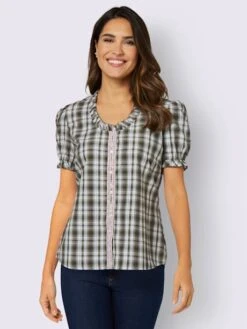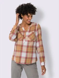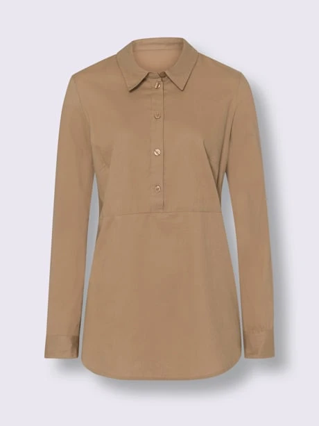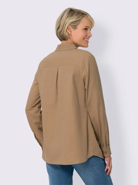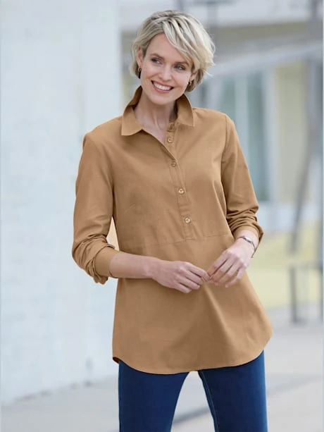 Chemisier manches longues à la coupe longue en imitation velours côtelé. Col chemise et patte de boutonnage courte. Pinces poitrine structurantes et empiècement avec pli affinant au dos. Manchettes boutonnées à la finition des manches. Ourlet légèrement arrondi devant et au dos.