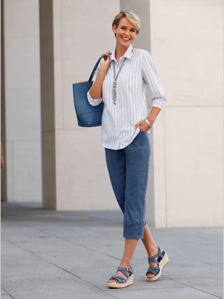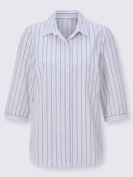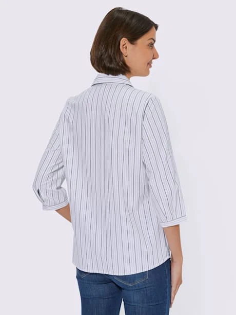 Ce chemisier doux avec pourcentage de coton séduit par son motif rayé. Col chemise, patte de boutonnage, poche poitrine plaquée pratique et manches 3/4 avec manchettes boutonnées à rayures horizontales. Ourlet légèrement arrondi devant. Coupe parfaite grâce aux pinces poitrine.