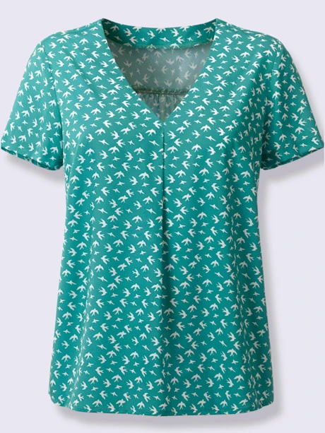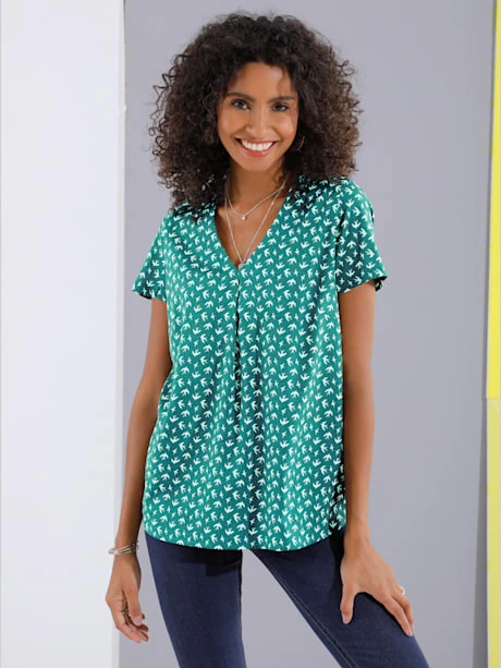 Ravissant : chemisier avec imprimé hirondelles ! Encolure en V, pli devant et ourlet légèrement arrondi pour dissimuler les petites rondeurs et sublimer la silhouette. Polyester recyclé.