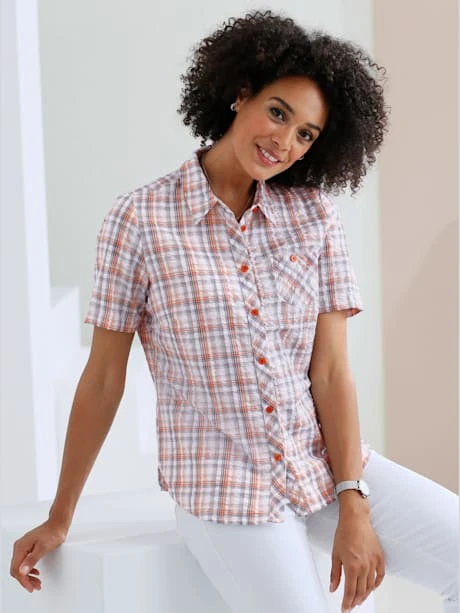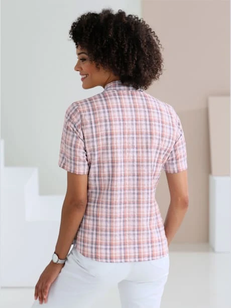 Chemisier seersucker à carreaux sport pour garder la tête ou le corps au frais, même par temps chaud. Col chemise, patte de boutonnage sur toute la longueur, 1 poche poitrine boutonnée plaquée, manches courtes et fentes latérales.