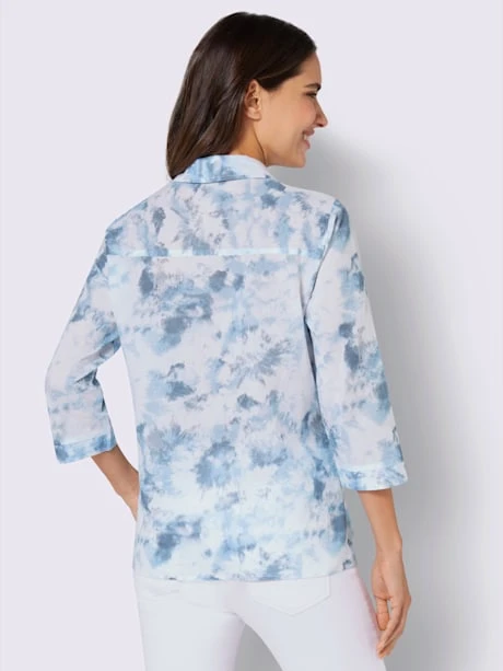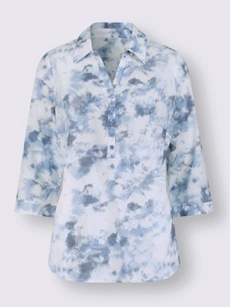 Chemisier tendance et agréable à porter imitation batik. Col chemise ouvert, patte de boutonnage courte et manchette fendue à la finition des manches 3/4.