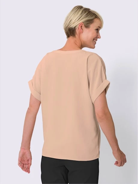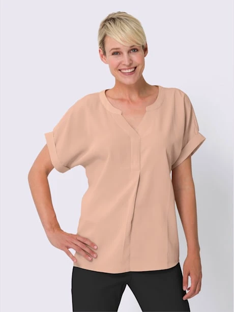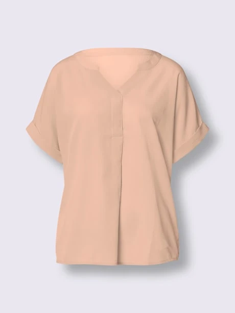 Qualité crêpe légère et estivale : chemisier avec encolure ronde, V ouvert et bordure. Mancherons. Pli devant pour une ampleur agréable. Faux revers aux manches.