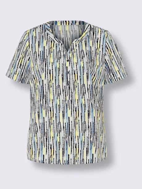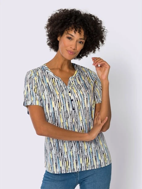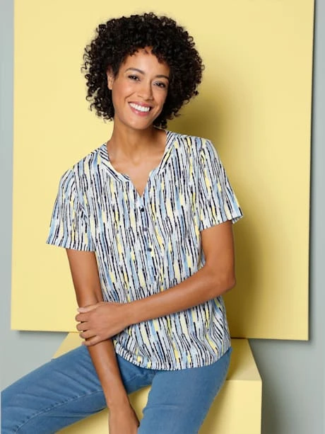 Ce chemisier imprimé offre beaucoup de peps et un prix très attractif ! Encolure ronde avec petit V, courte patte de boutonnage et pinces poitrine.