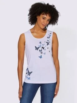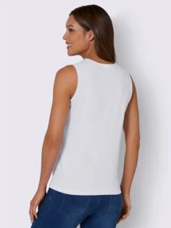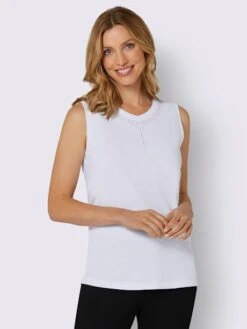 Débardeur basique à petit prix. Encolure ronde avec petit V, patte de boutonnage avec boutons à l`aspect nacré. Jersey fin.
