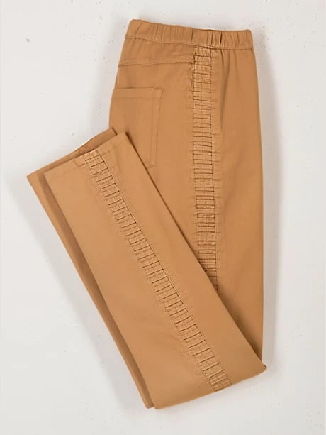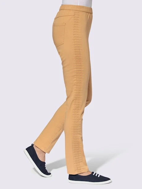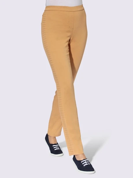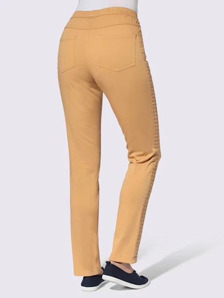 À découvrir absolument : votre nouvelle pièce facile à associer ! Jean avec empiècements affinants et décoratifs et piquage nervuré le long des coutures latérales. Ceinture élastique et qualité extensible pour plus de confort. Empiècement au dos et poches arrière plaquées. Largeur pieds env. 36 cm.