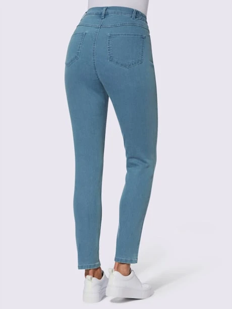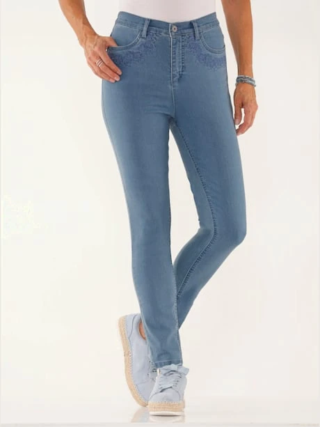 Die florale Stickerei an den seitlichen Taschen ist bei dieser Jeans ein absoluter Hingucker. Ceinture élastique latérale, passants, fermeture à glissière et bouton. Tenue parfaite grâce à l’empiècement au dos. Poches arrière plaquées. Largeur pieds env. 30 cm.