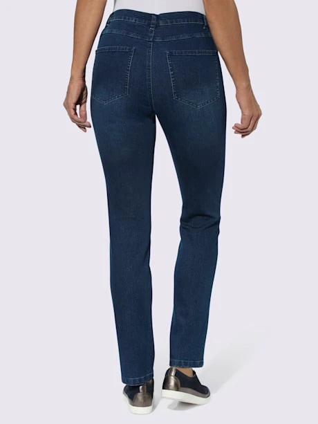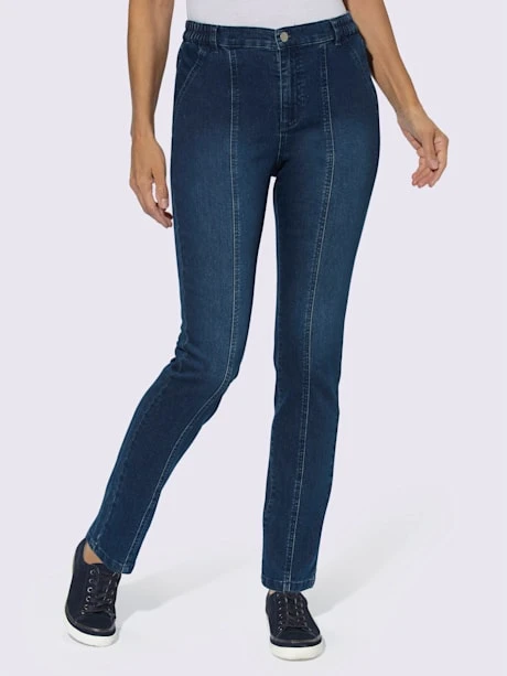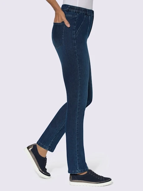 Jean confortable légèrement délavé. Ceinture élastique latérale, passants, glissière et bouton. 2 fausses poches et coutures de séparation affinantes devant. Empiècement, 2 poches plaquées au dos. Largeur pieds env. 34 cm. Livré sans la ceinture.