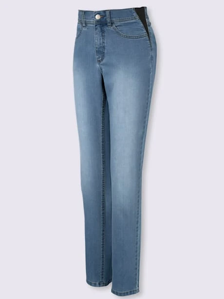 Jean coupe 4 poches très confortable grâce à l’empiècement en V élastique noir au niveau des hanches. Ceinture à passants, glissière et bouton devant. Empiècement au dos. 2 poches devant et au dos. Largeur pieds env. 36 cm.