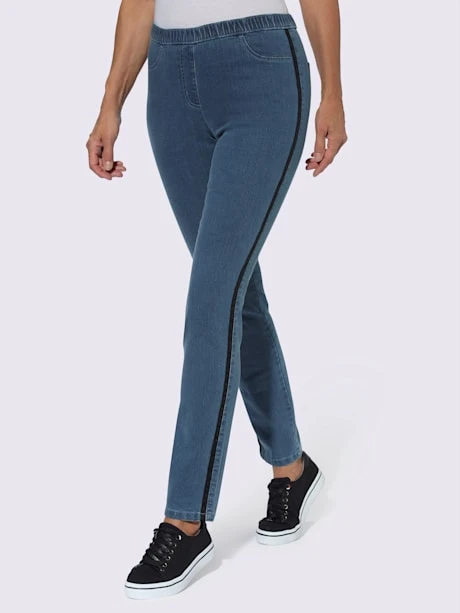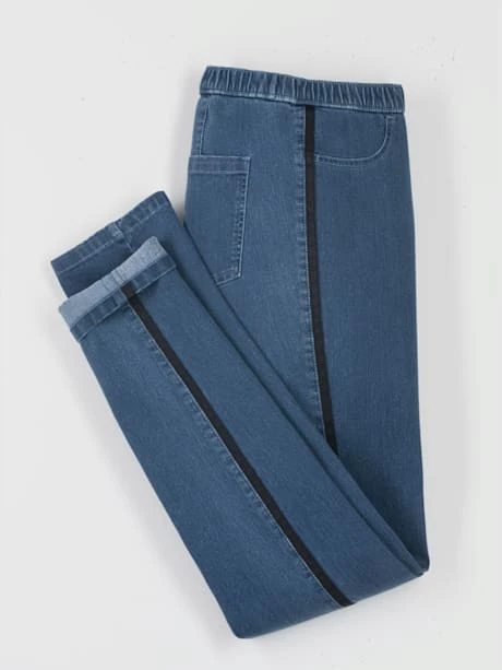 Un incontournable pour les jours froids : ce jean thermique vous tiendra chaud ! Ceinture élastique confortable, 2 fausses poches devant et 2 poches plaquées derrière. Rayures galon affinantes. Intérieur gratté doux. Qualité extensible. Largeur pieds env. 34 cm.