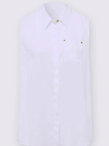 Facile à assortir l’été ! Liquette avec détails couleur or sur le bouton supérieur et les rivets sur la poche poitrine plaquée. Col chemise, patte de boutonnage invisible et ourlet légèrement arrondi.