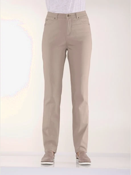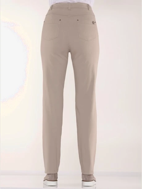 Pantalon extensible 5 poches. Qualité extensible et ceinture élastique sur les côtés pour un confort optimal. Fermeture à glissière et bouton devant, passants. 2 poches avec rivet devant et au dos. 1 poche de gousset supplémentaire devant, coupe parfaite au dos et détail fantaisie : 1 poche avec application étoiles. Largeur pieds env. 36 cm.