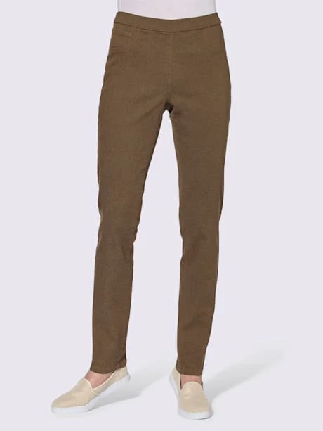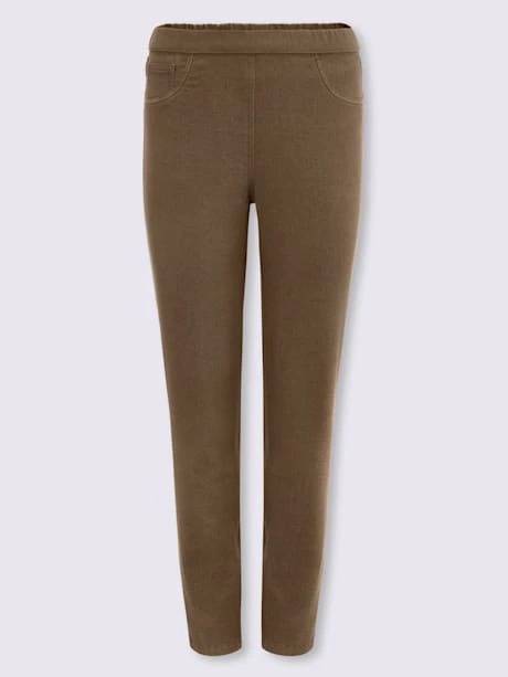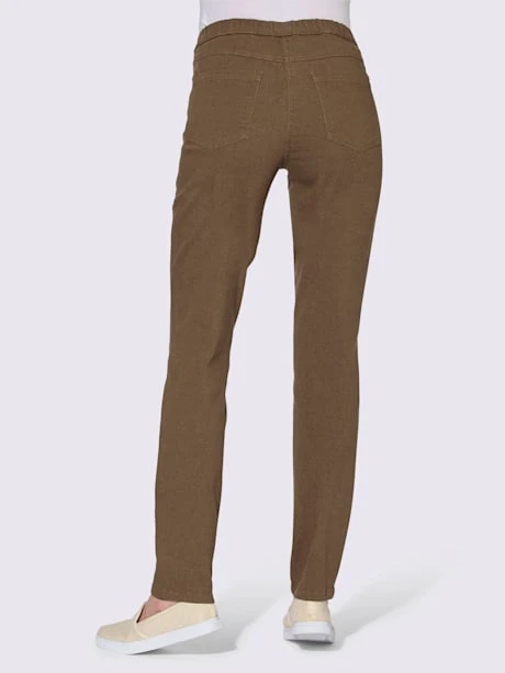 Facile à associer : pantalon extensible en qualité twill tout simplement indispensable. Imitation jean tendance. Ceinture élastique au dos avec partie lisse. Fausses poches devant. 2 poches plaquées au dos. Empiècement. Largeur pieds env. 32 cm.