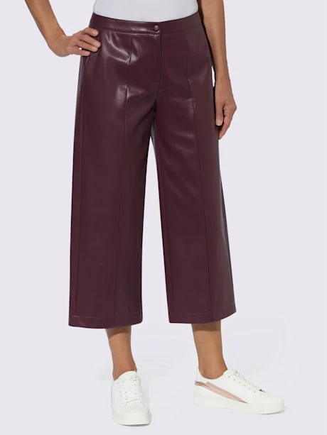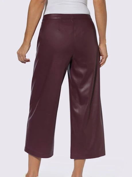 Pantalon en synthétique, coupe jupe-culotte courte tendance et qualité souple. Les jambes larges sont également dotées de coutures de séparation affinantes. Ceinture et pinces au dos pour un confort optimal et une coupe parfaite. Largeur pieds env. 56 cm.