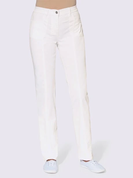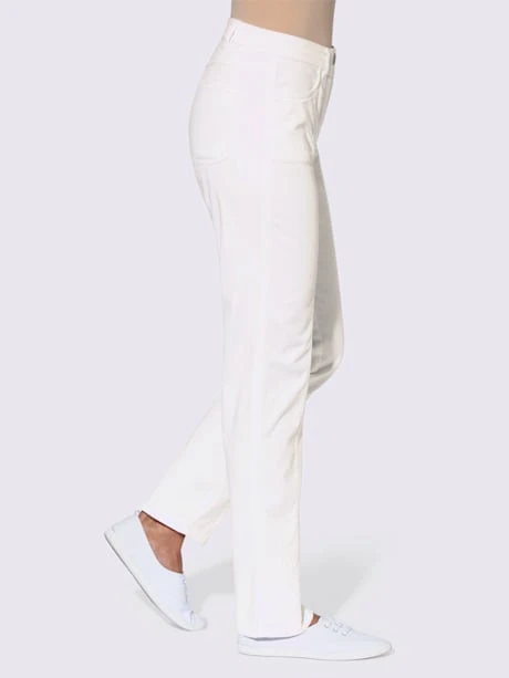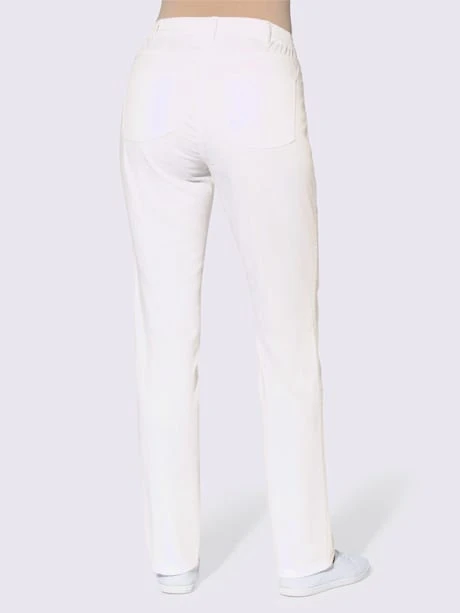 Ce pantalon extensible saura vous séduire ! Coutures de séparation affinantes devant. Coutures décoratives à la ceinture et au bas des jambes. Ceinture élastique latérale avec passants et fermeture à glissière et bouton. 4 poches. Empiècement. Lavez, séchez, portez ! Largeur pieds env. 38 cm.