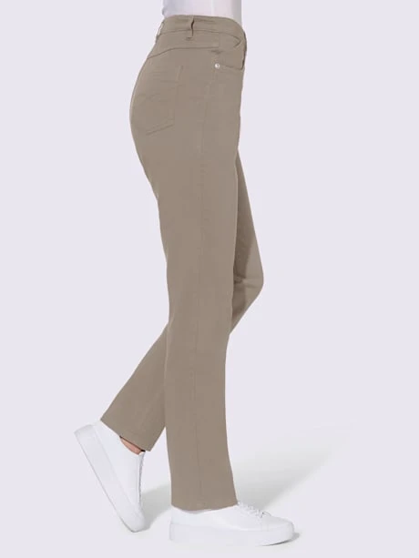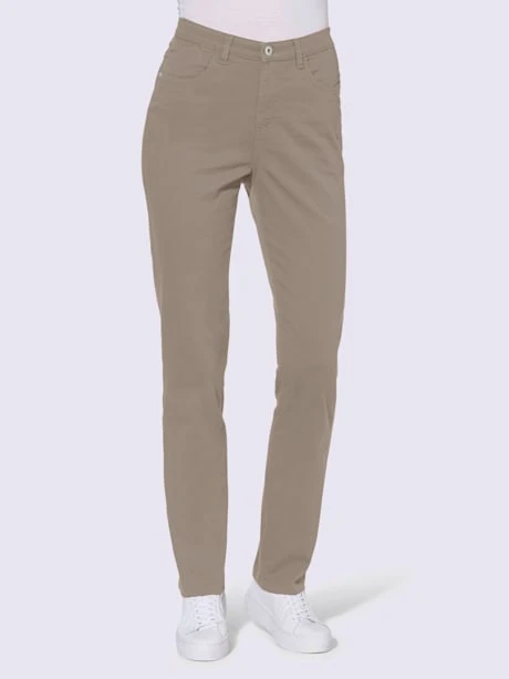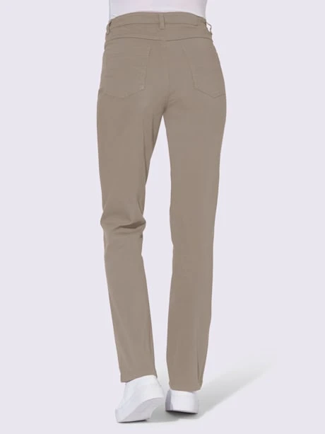 Pantalon extensible toujours très tendance en qualité twill. Coupe 5 poches avec broderie sur les poches arrière. Ceinture élastique latérale. Passants. Fermeture à glissière et bouton. Empiècement pour une coupe parfaite ! Largeur pieds env. 36 cm.