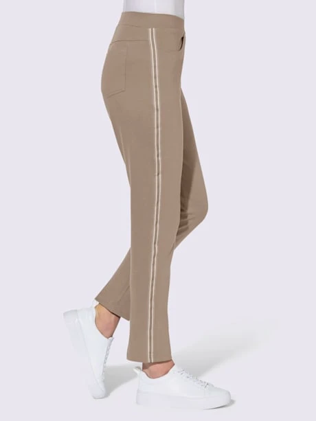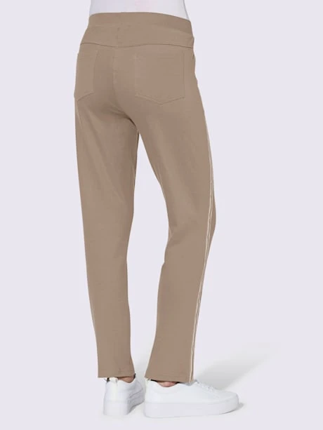 Vous ne voudrez plus le quitter : pantalon en jersey qualité sweat extrêmement confortable. Magnifiques rayures galon. Ceinture élastique pour un enfilage facile. Poches devant. Empiècement pour une tenue parfaite. Coutures latérales préposées. Largeur pieds env. 32 cm.