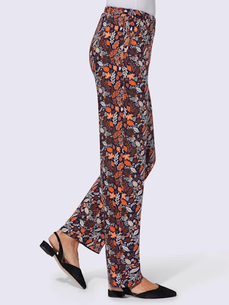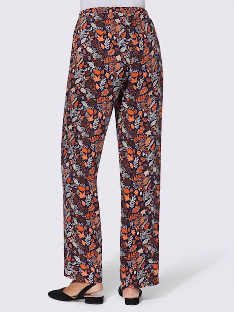 Pantalon décontracté au superbe imprimé feuilles. Ceinture élastique pour un confort optimal. 2 poches latérales. Qualité douce et fluide. Largeur pieds env. 46 cm.