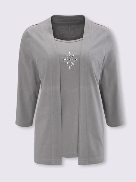 Vous ferez toujours mouche avec ce T-shirt 2 en 1 au look superposé. Petites pierres fantaisie sous l’encolure. Manches 3/4.