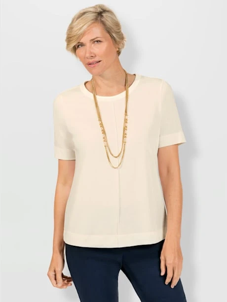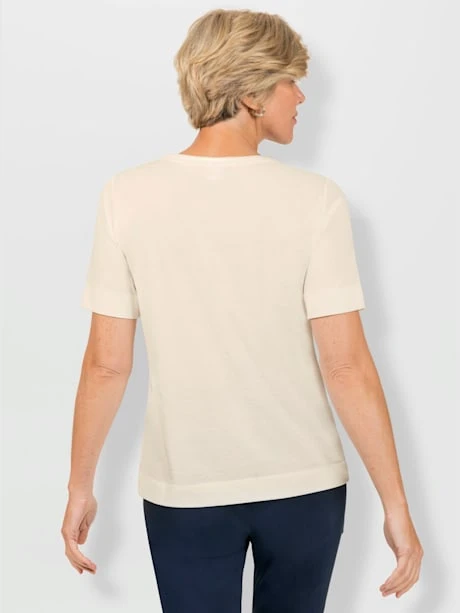 T-shirt avec passepoil satinĂ© Ă l’encolure ronde. Nervures affinantes devant. ExtĂ©rieur brillant, intĂ©rieur très doux. Manches mi-longues. Soutient l’initiative « Cotton made in Africa ».