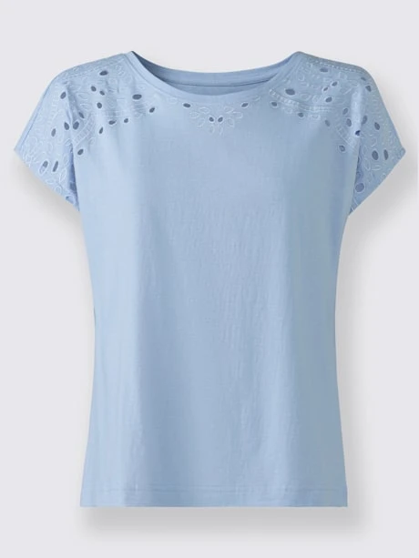 Vous allez vous adorer dans ce superbe T-shirt ! Broderie aux couleurs harmonieuses et charmantes découpes le long de l’encolure ronde passepoilée et sur les mancherons. Achetez ce vêtement et soutenez l’initiative « Cotton made in Africa ».