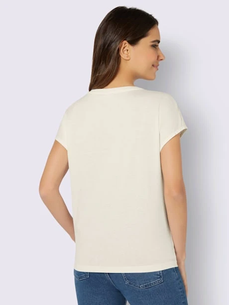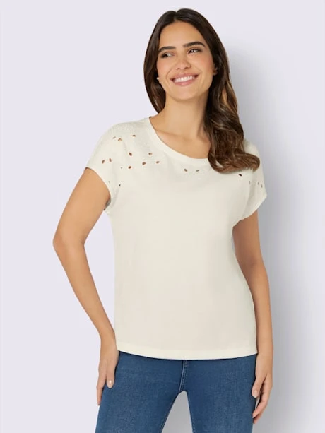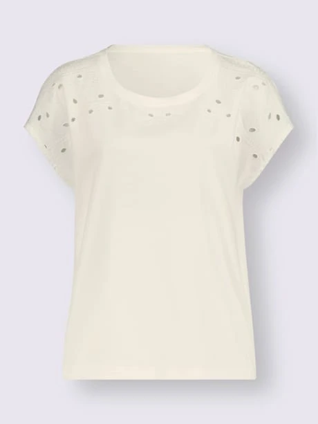 T-shirt à encolure ronde avec jolie broderie ajourée à l’encolure et aux mancherons.
