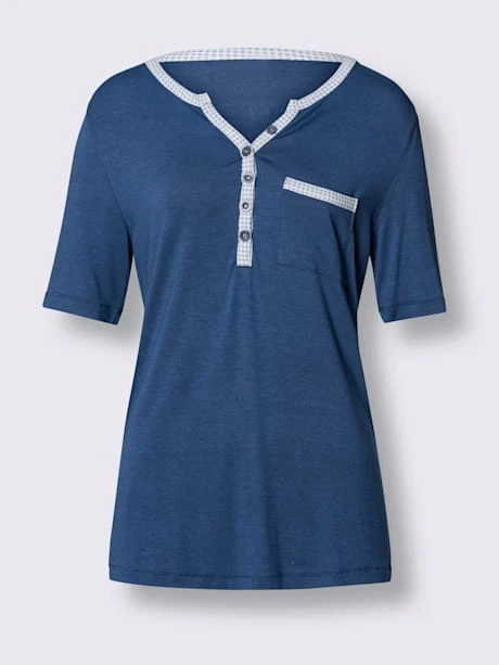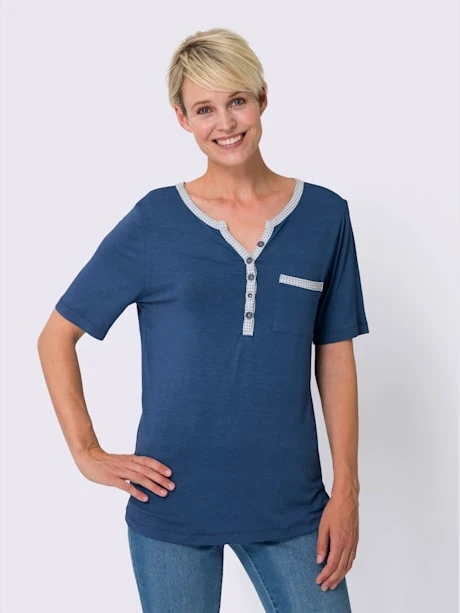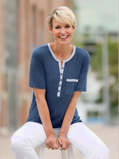 Associez ce T-shirt à manches courtes selon vos envies. Bordures contrastées. Encolure ronde avec petit V, patte de boutonnage courte et poche poitrine. Repassage superflu : lavez, séchez et portez ! Qualité viscose ultra-douce et respirante.