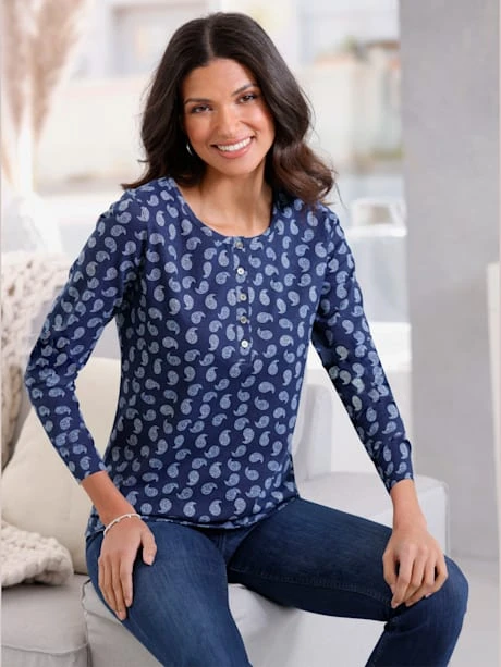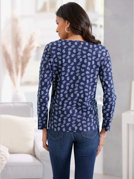 T-shirt au motif paisley tendance sur toute la surface. Incontournable pour toutes les amatrices de mode ! Encolure ronde et patte de boutonnage courte. Manches longues.
