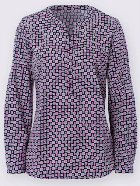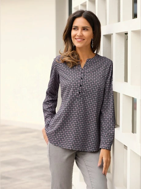 Petits motifs tendance ! Tunique ultra-tendance au prix imbattable. Encolure ronde avec petit V et patte de boutonnage courte. Manches longues à manchettes boutonnées.